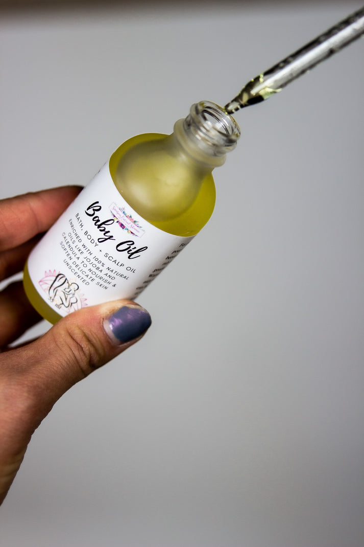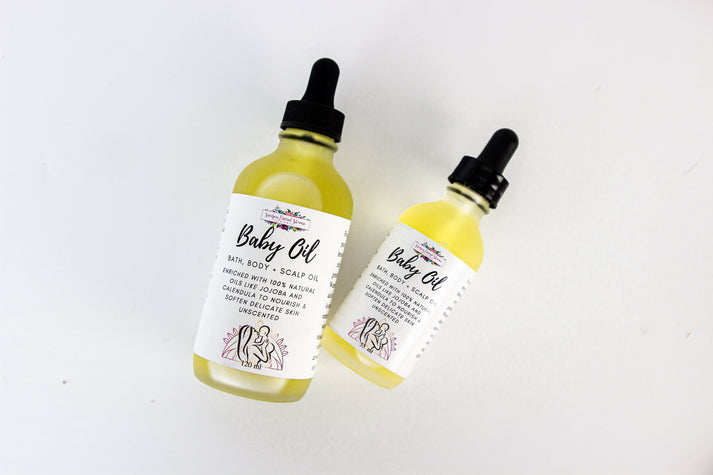 Our Baby Oil blends hydrating oils of coconut, jojoba + camellia seed, and moisturizing extracts of evening primrose, calendula and marshmallow root. Our Unscented formula is gentle enough for even the most delicate skin! These ingredients work together to deeply hydrate, nourish + soften skin.